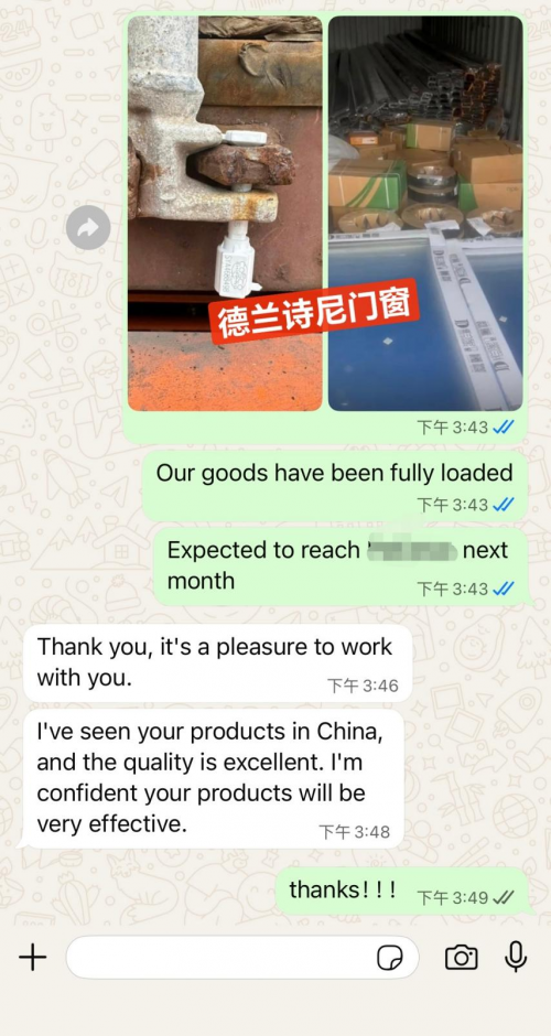 在合作过程中,双方通过即时通讯工具保持高效沟通。德兰诗尼团队及时向客户通报货物动态:“Our goods have been fully loaded. Expected to reach next month。”(货物已全部装车,预计下月抵达马来西亚。)客户在确认货物到达后,也主动配合进行数量清点,并反馈:“The product look great。”(产品看起来很棒。)