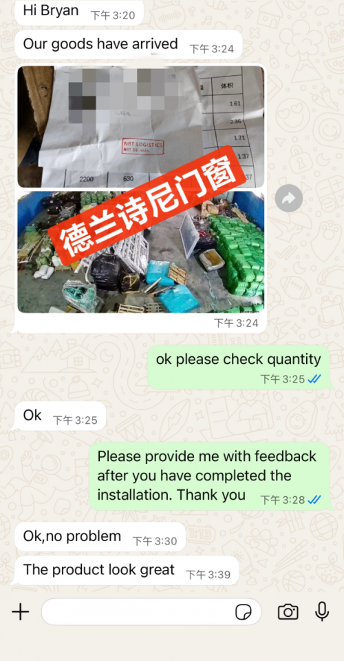 项目最终阶段,客户发来安装现场图片,显示德兰诗尼门窗已在建筑中投入使用。窗外视野开阔,安装工艺整洁规范。客户在反馈中特别强调“质量非常好”,从实际使用角度肯定了产品的密封性、耐用性与整体品质。